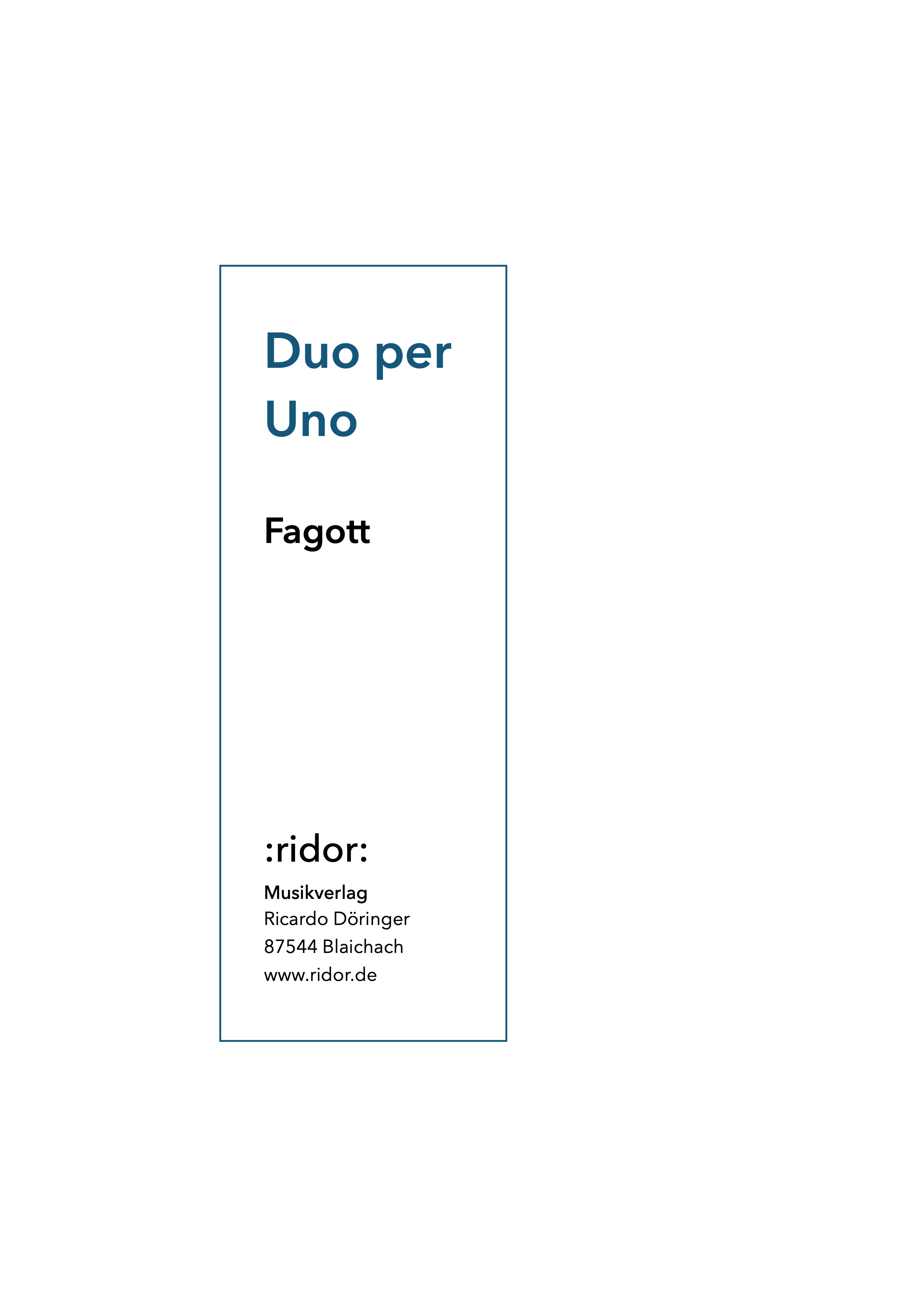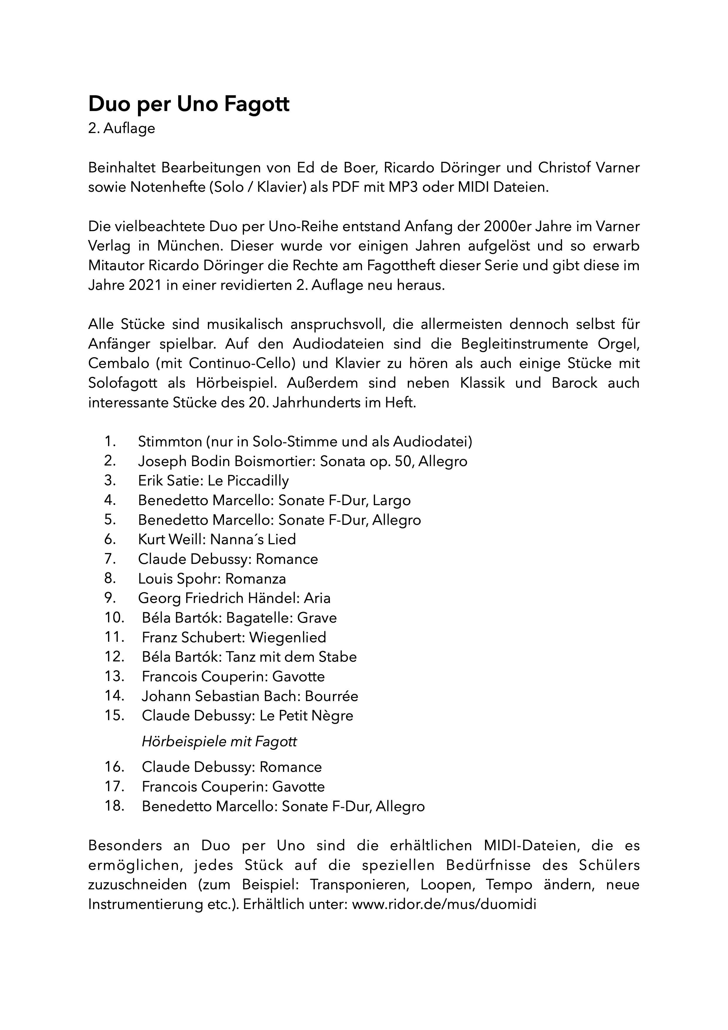 Die vielbeachtete Duo per Uno-Reihe entstand Anfang der 2000er Jahre im Varner Verlag in München. Dieser wurde vor einigen Jahren aufgegeben und so erwarb Mitautor Ricardo Döringer die Rechte am Fagottheft dieser Serie und gibt diese im Jahre 2021 in einer revidierten 2. Auflage neu heraus.