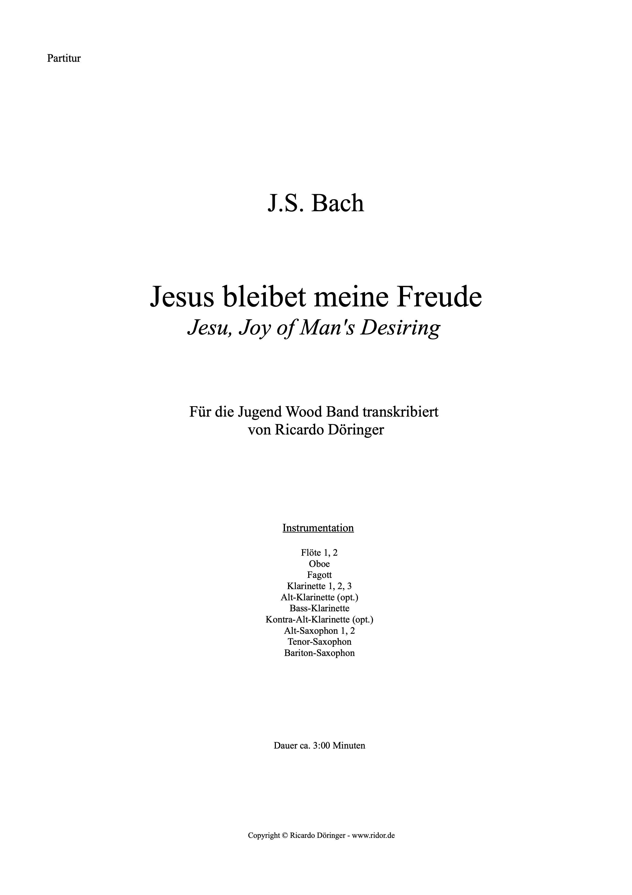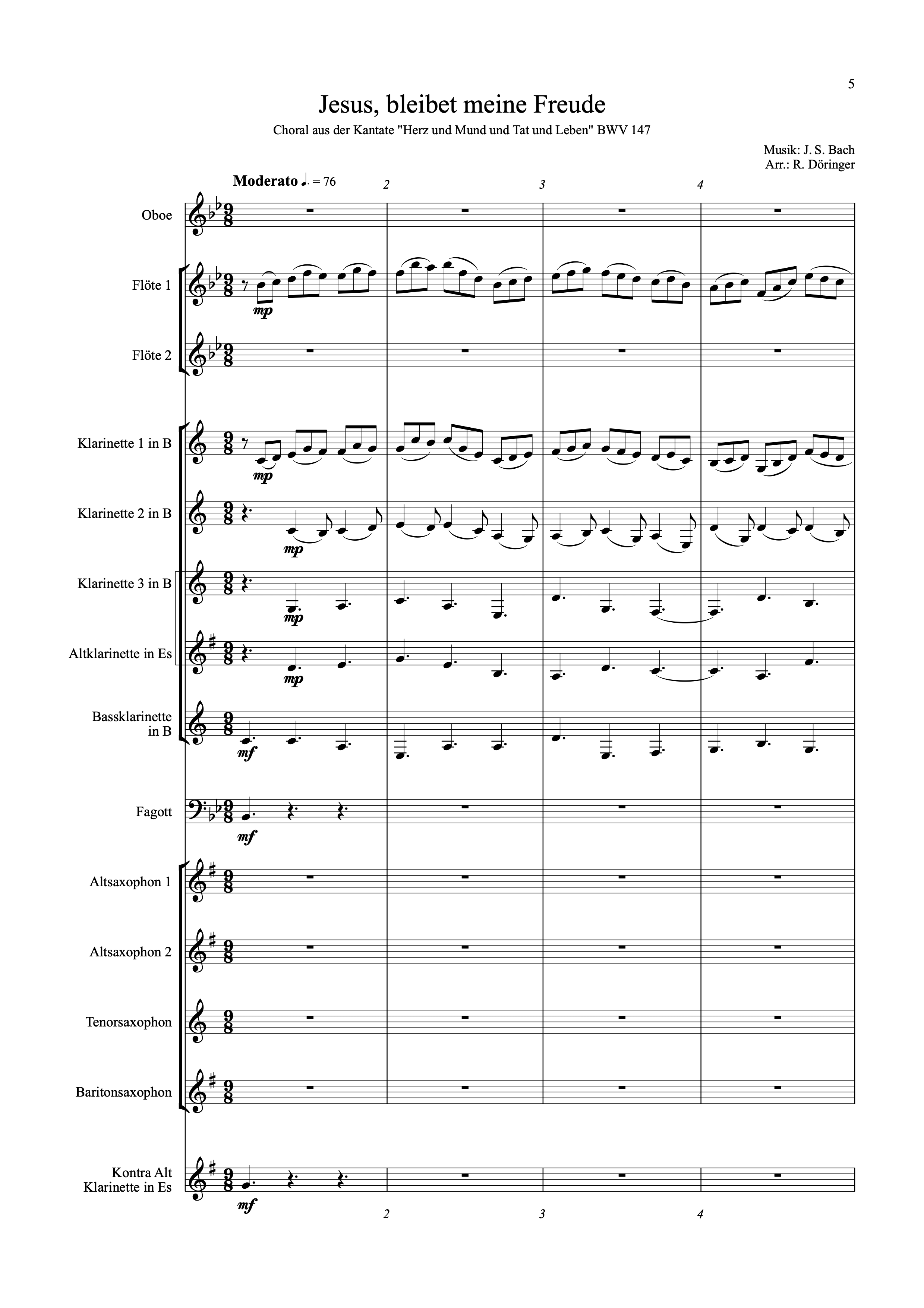 Bachs berühmter Choral „Jesus bleibet meine Freude“, der zu den meistarrangierten Bachstücken gehört, beschließt die beiden Teile der 1716 komponierten und 1723 revidierten Kantate „Herz und Mund und Tat und Leben“ und ist eine Art Gigue für Streicher und Orgel, zu der abschnittweise der vierstimmige Choral hinzutritt. Dieser Choral weist im Original nur die Bläser Oboen und Trompete auf, welche die Choralmelodie im Sopran mitspielen. Dazu kommen die drei Unterstimmen des Chores und ein vierstimmiger Streichersatz mit einem besonders eingängigen, tänzerischen Motiv, das dem Stück seinen späteren Ruhm bescherte. In dieser Fassung übernehmen Flöte und Oboe den Part der Trompete, die Streicher werden von den Klarinetten übernommen und der Chor wird vom Saxophonregister gespielt.